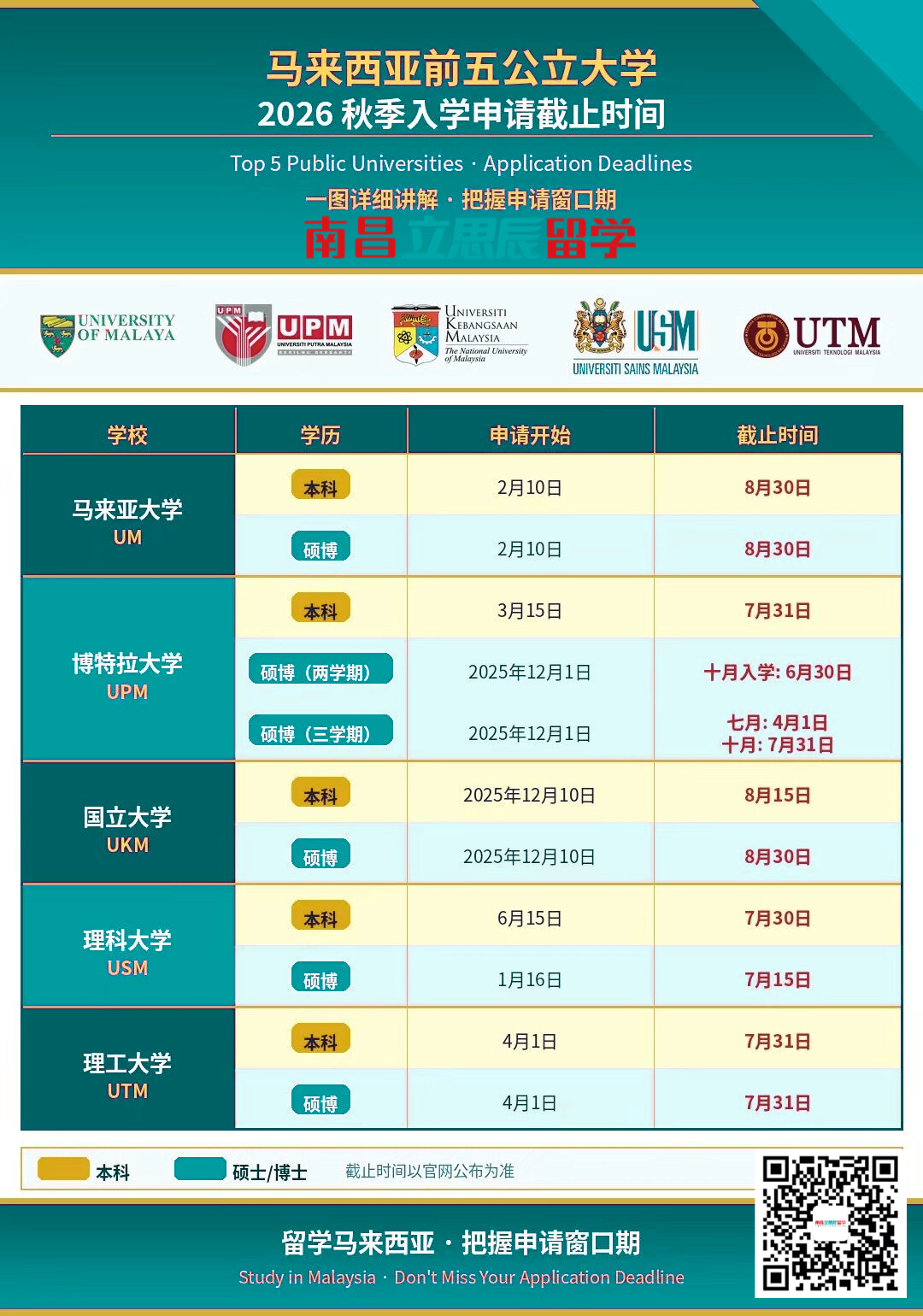 目前,马来西亚前五公立大学的2026年秋季入学申请通道已陆续开放。提前规划、准备材料并在截止日期前提交,是成功迈入理想学府的关键一步。